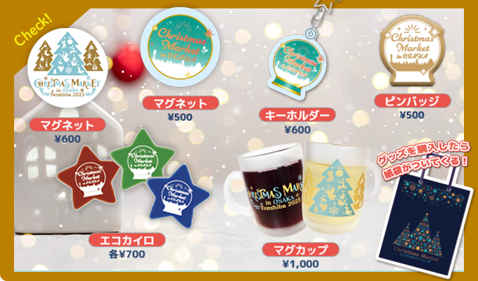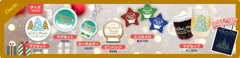 焼きソーセージにクリスマスオーナメントなどが売られています。